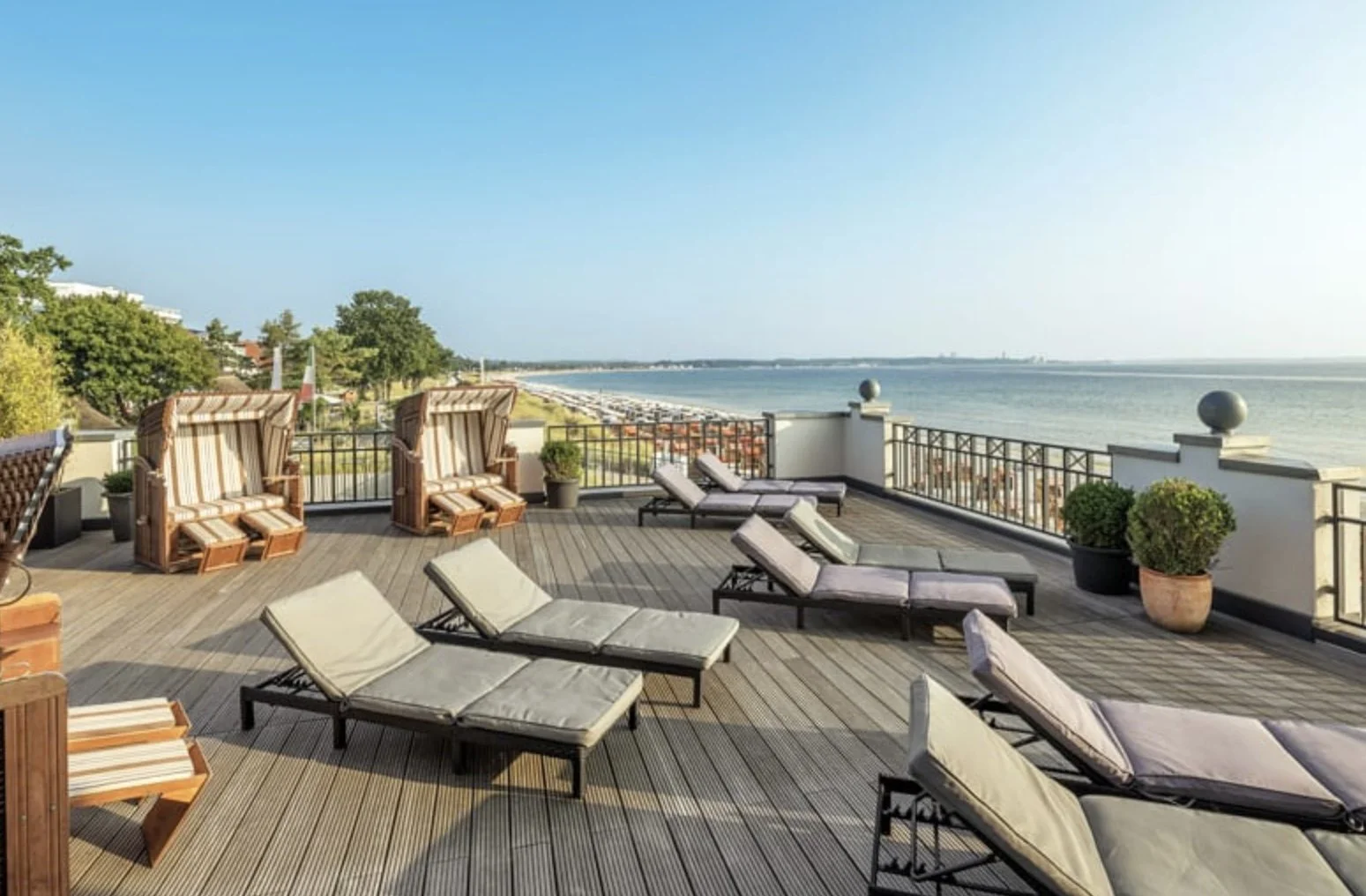 Die Dachterrasse ist für mich das absolute Herzstück des Hotels. Tagsüber ein Rückzugsort mit Sonnenliegen und einer fantastischen Aussicht über die Lübecker Bucht, abends verwandelt sich der Bereich in eine stylische Skybar mit Cocktails und DJ-Sets an manchen Abenden. Die Sonnenuntergänge von hier oben? Atemberaubend. Es fühlte sich an, als säße man auf dem Deck eines schicken Kreuzfahrtschiffs – nur ohne Seegang.