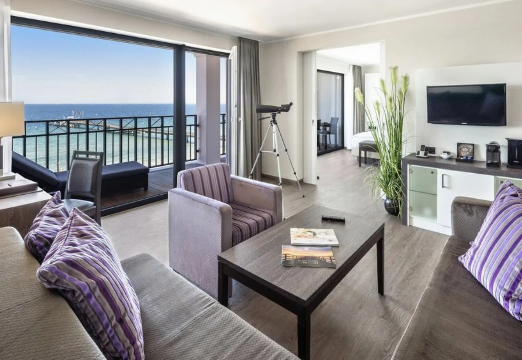 Ich hatte ein Zimmer mit Meerblick gebucht – und was soll ich sagen? Es war die richtige Entscheidung. Der erste Eindruck: klare Linien, viel Weiß, durchbrochen von warmen Holzelementen und einem Hauch von maritimer Eleganz. Das Bett war groß und komfortabel, die Matratze fest, aber angenehm nachgiebig – ich habe hervorragend geschlafen. Die Glasfront zur Ostsee hin ließ sich komplett öffnen, sodass ich abends dem Rauschen der Wellen lauschen konnte. Das Bad: modern, mit Regendusche und cleverer Beleuchtung. Alles blitzsauber.