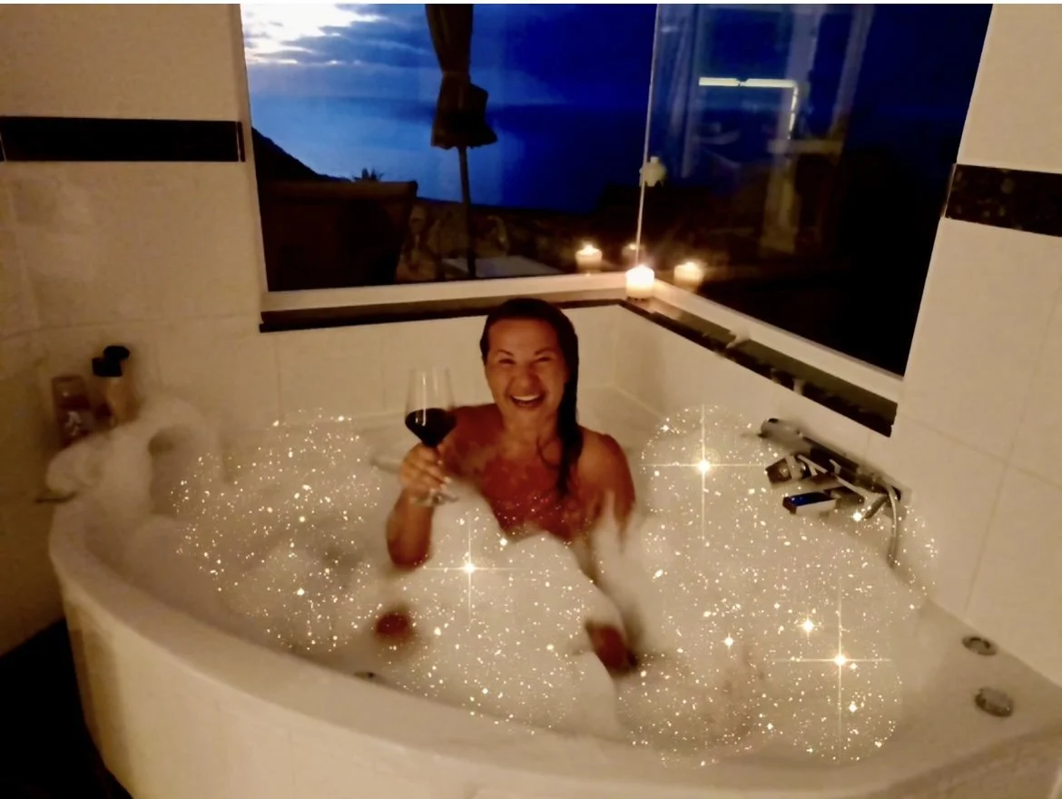Unser Luxus Studio „ Casa Bruno „war geräumig mit 2 Terrassen, Meerblick und einer kleinen Küche zum Kochen ausgestattet, wie auch mit einem Whirlpool und einem direktem Zugang zum Swimmingpool und zur Sauna.